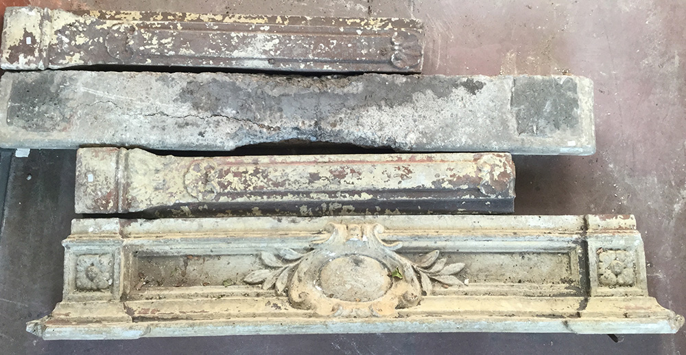 Antico camino in cemento con decori floreali e tracce di pittura bordeaux (cm 144x142x24) (difetti e mancanze)