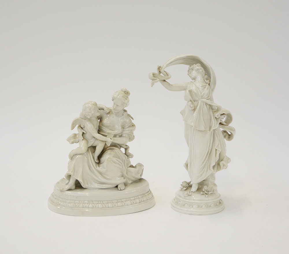 Manifattura italiana. Lotto composto da due gruppi in porcellana bianca raffiguranti vestale e allegoria (difetti)