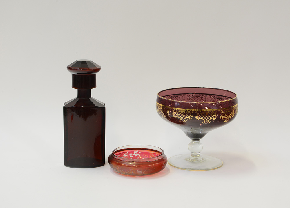Manifatture diverse. Lotto composto da una bottiglia con tappo, un centrotavola e una ciotola in vetro e cristallo (difetti)