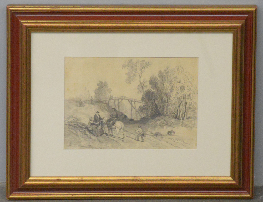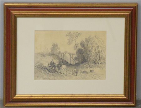 "Paesaggio con viandanti" disegno (cm 18x25) firmato in basso a sinistra, in cornice (lievi difetti)