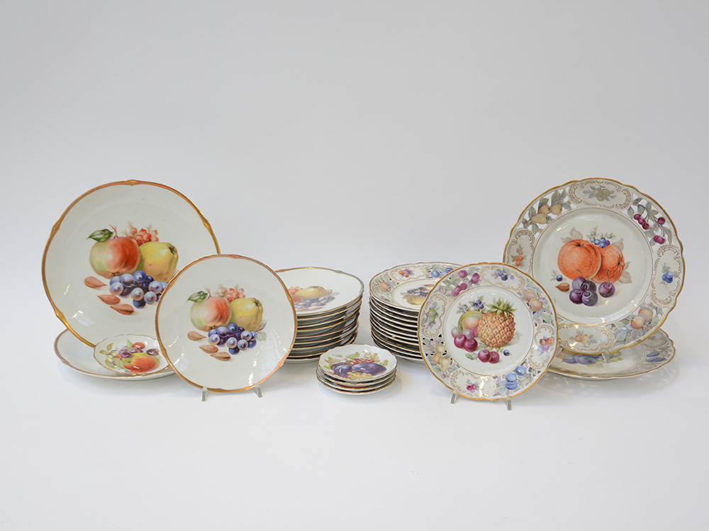 Manifatture diverse. Lotto composto da parti di servizi da dolce in porcellana policroma decorati nel cavetto con frutta (difetti)