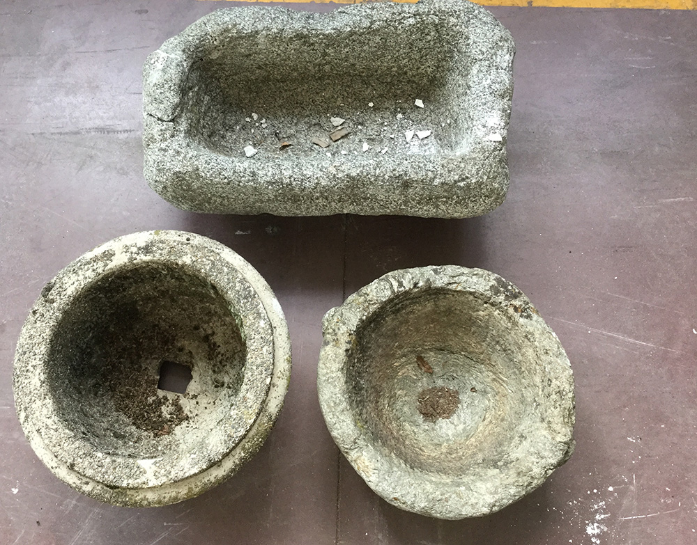 Lotto di due fioriere da giardino in pietra e una baccellata in cemento(difetti)