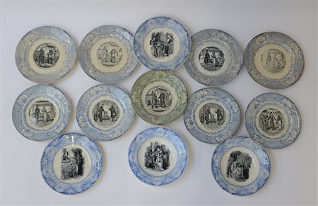 Manifatture diverse. Lotto composto da tredici piatti in ceramica policroma...