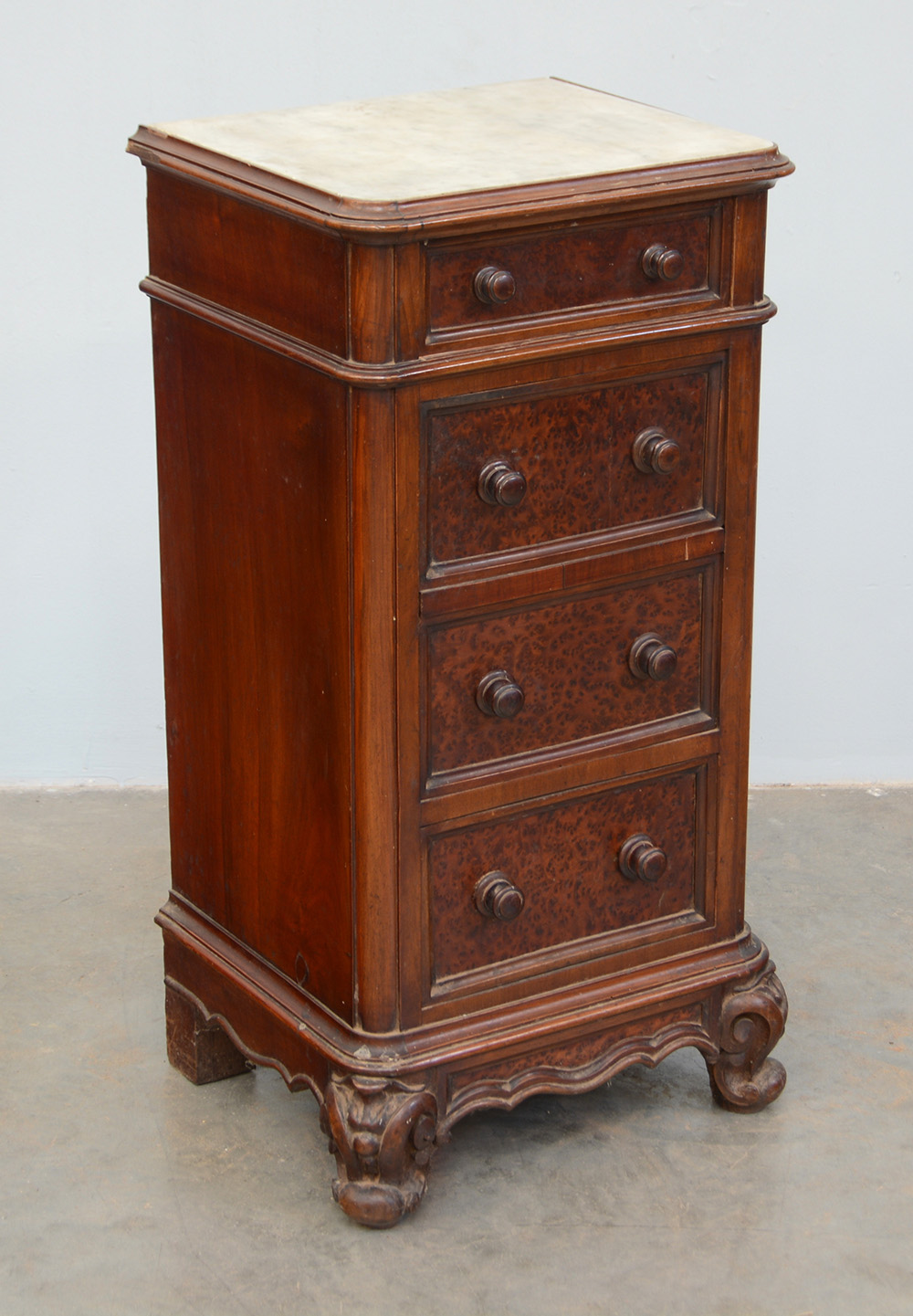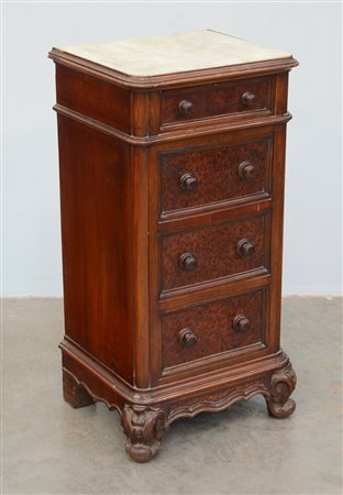 Comodino ad un'anta e due cassetti con gambe intagliate. Piano in marmo (cm...