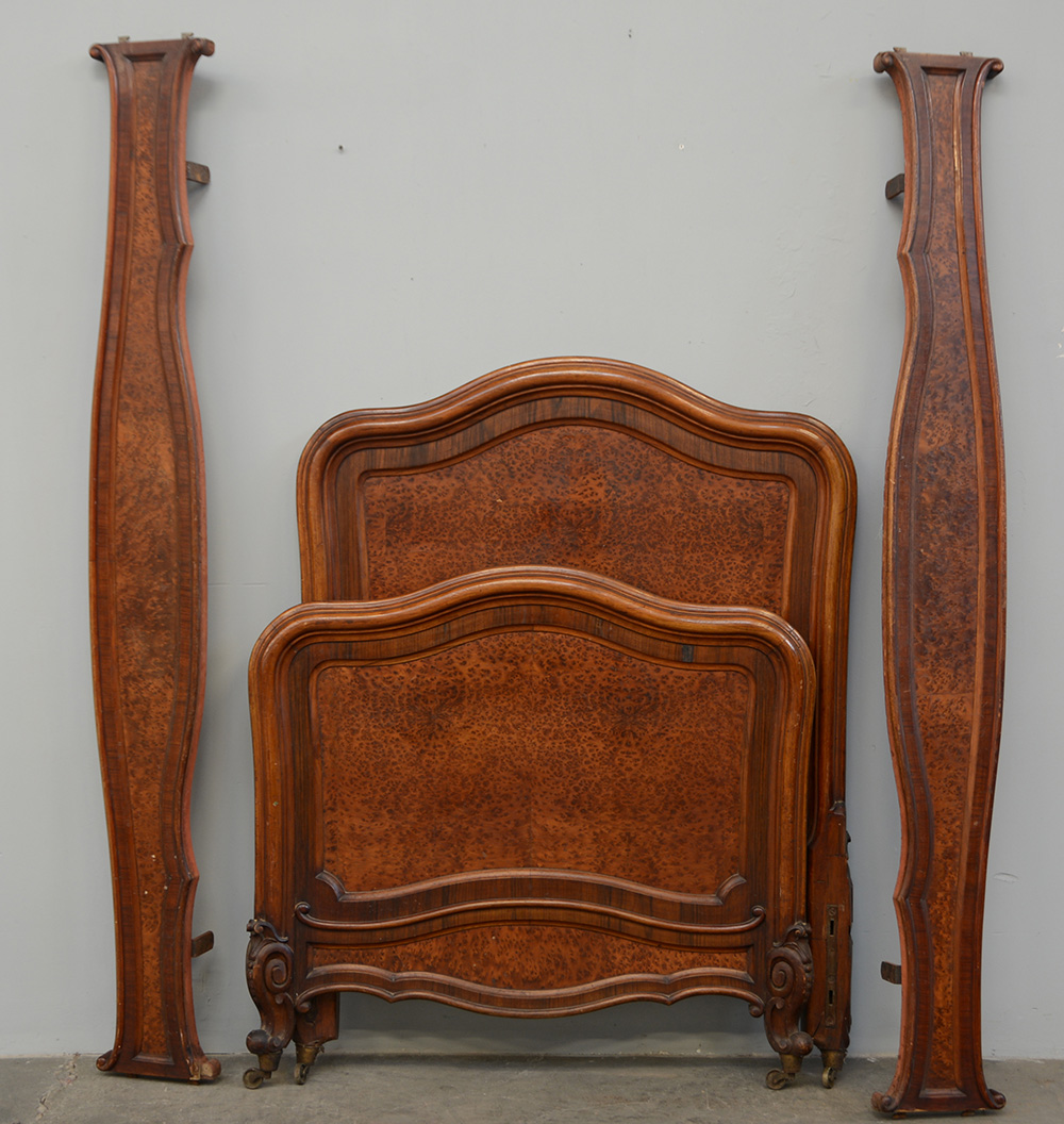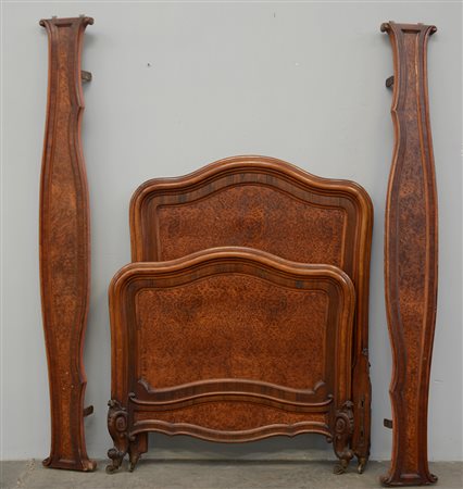Letto a una piazza con testata e pediera in radica. Piedi intagliati (difetti)