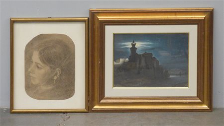 Lotto composto da un disegno raffigurante figura femminile con firma indecifrata e un dipinto ad olio raffigurante notturno con castello, in cornici (misure diverse)(difetti)