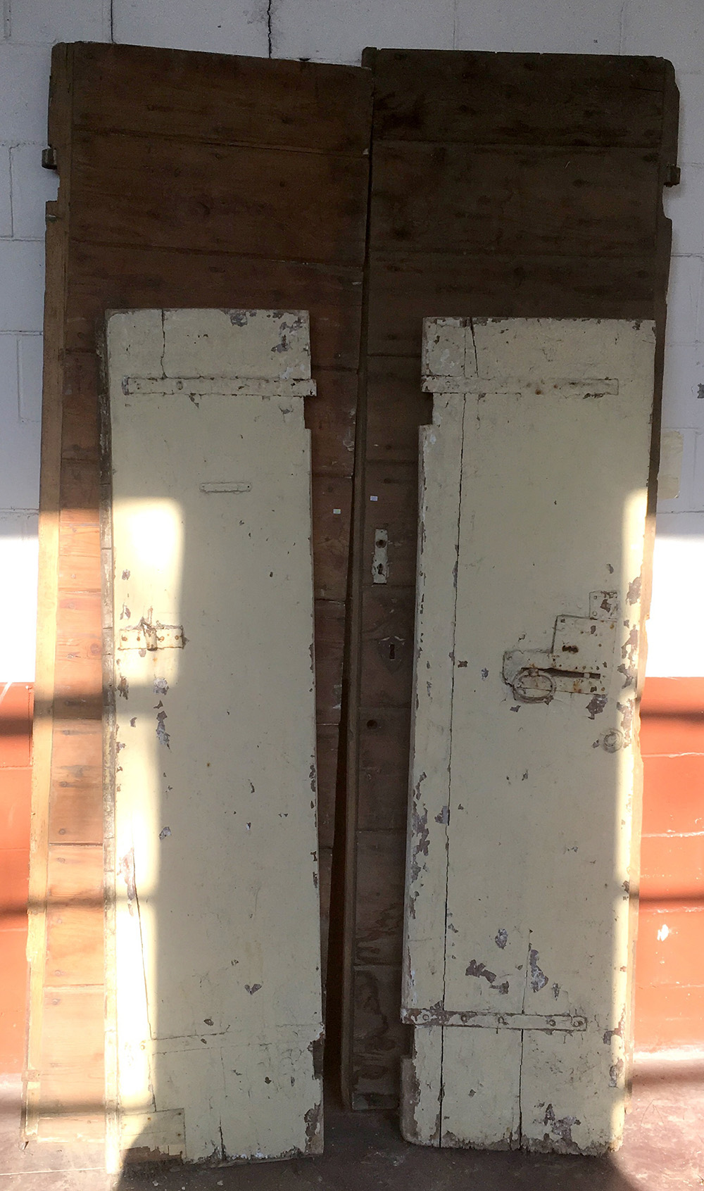 Lotto di due portoni rustici a due battenti in legno con pannelli orizzontali...