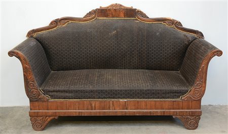 Divano lastronato in noce con montanti, gambe e schienali intagliati a riccioli e volute. Secolo XIX (largh. cm 188) (difetti)