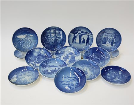 Manifattura danese. Gruppo di sedici piatti in porcellana a soggetto natalizio di varie annate (difetti)