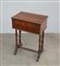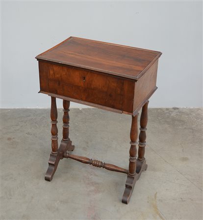Tavolino da lavoro ad un cassetto con piano apribile celante vani. Gambe sagomate riunite da traversa. Secolo XIX (cm 50x71x34) (difetti)