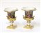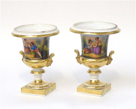 Due vasetti biansati in porcellana bianca e oro, decorati in policromia con scene galanti