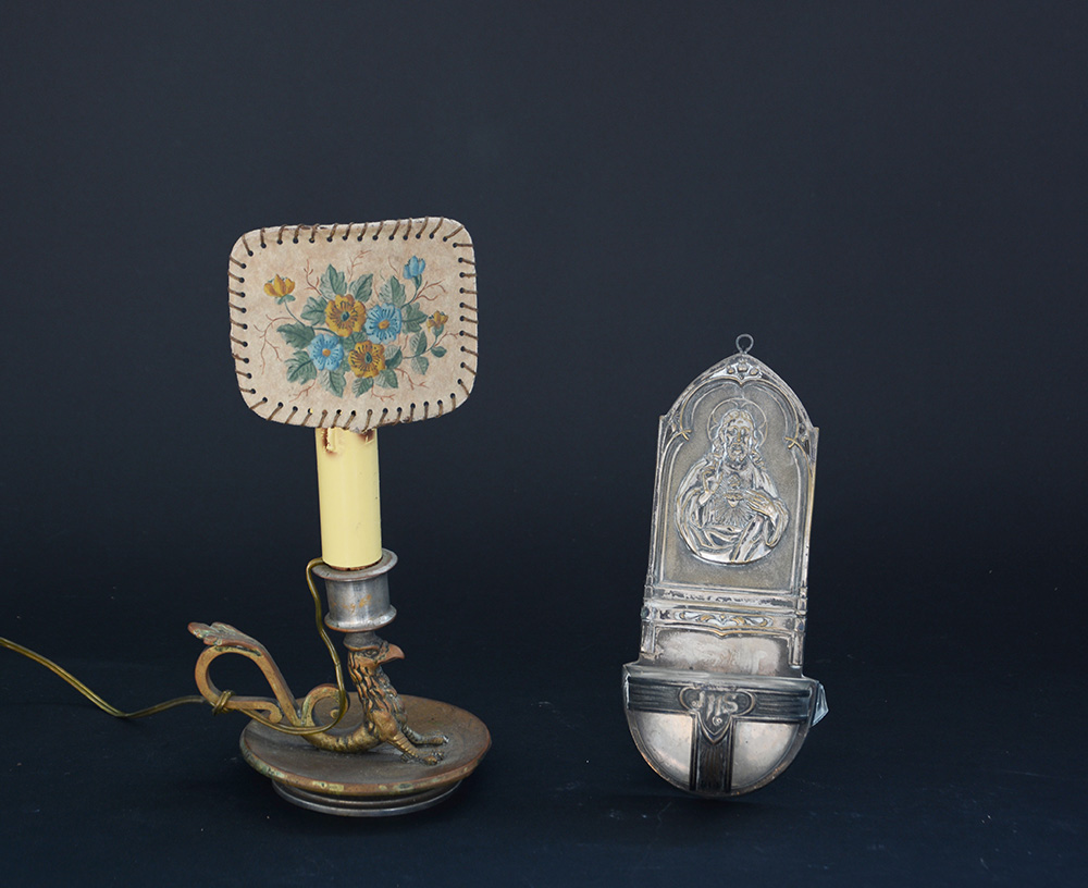 Lotto composto da un'acquasantiera in metallo e vetro e un abat jour decorata con grifone (difetti)