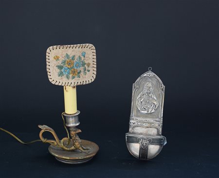 Lotto composto da un'acquasantiera in metallo e vetro e un abat jour decorata...