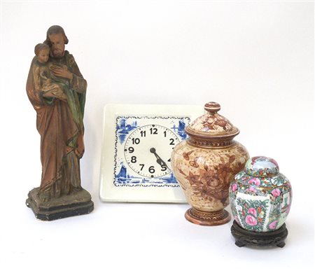 Lotto composto da due vasi con coperchio, un orologio da muro in ceramica e una scultura raffigurante San Giuseppe con bambini (difetti)