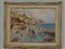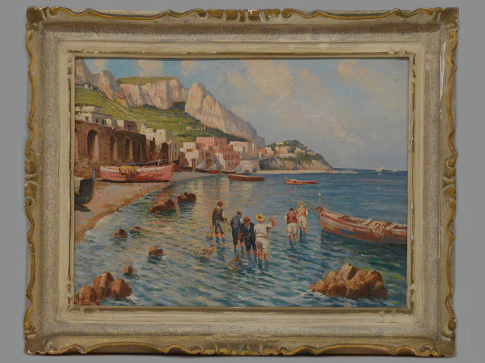 "Marina con barche e pescatori", olio su compensato (cm 30x40), firmato in basso a sinistra, in cornice. (Difetti).