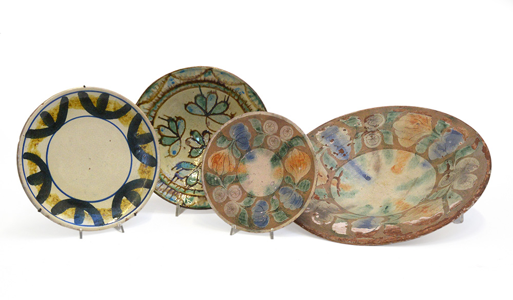 Lotto composto da un bacile e tre piatti in ceramica e terracotta di decori e manifatture diverse (difetti)