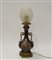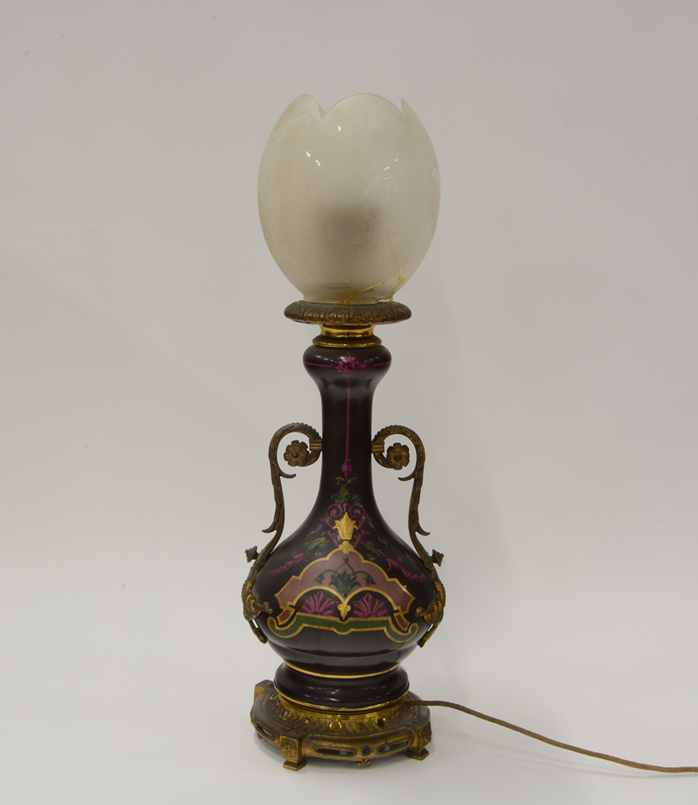 Lampada da tavolobiansata in ceramica policroma e ottone dorato. Paralume in vetro. Inizio sec. XX (difetti)