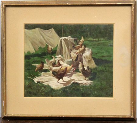 "Galline" olio su cartone (cm 23x28) firmato e datato '920 in basso a sinistra. Timbro al retro. In cornice