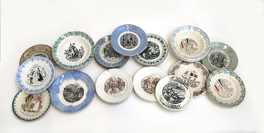 Lotto di 28 piatti in ceramica decorata a soggetti storici, misure diverse (difetti e mancanze)