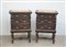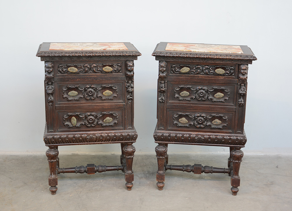 Coppia di comodini a tre cassetti con fronte e montanti intagliati (cm 58x88x38)