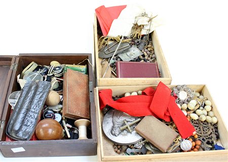 Lotto composto da tre scatole contenenti medaglie, rosari e santini di diversa epoca (difetti)