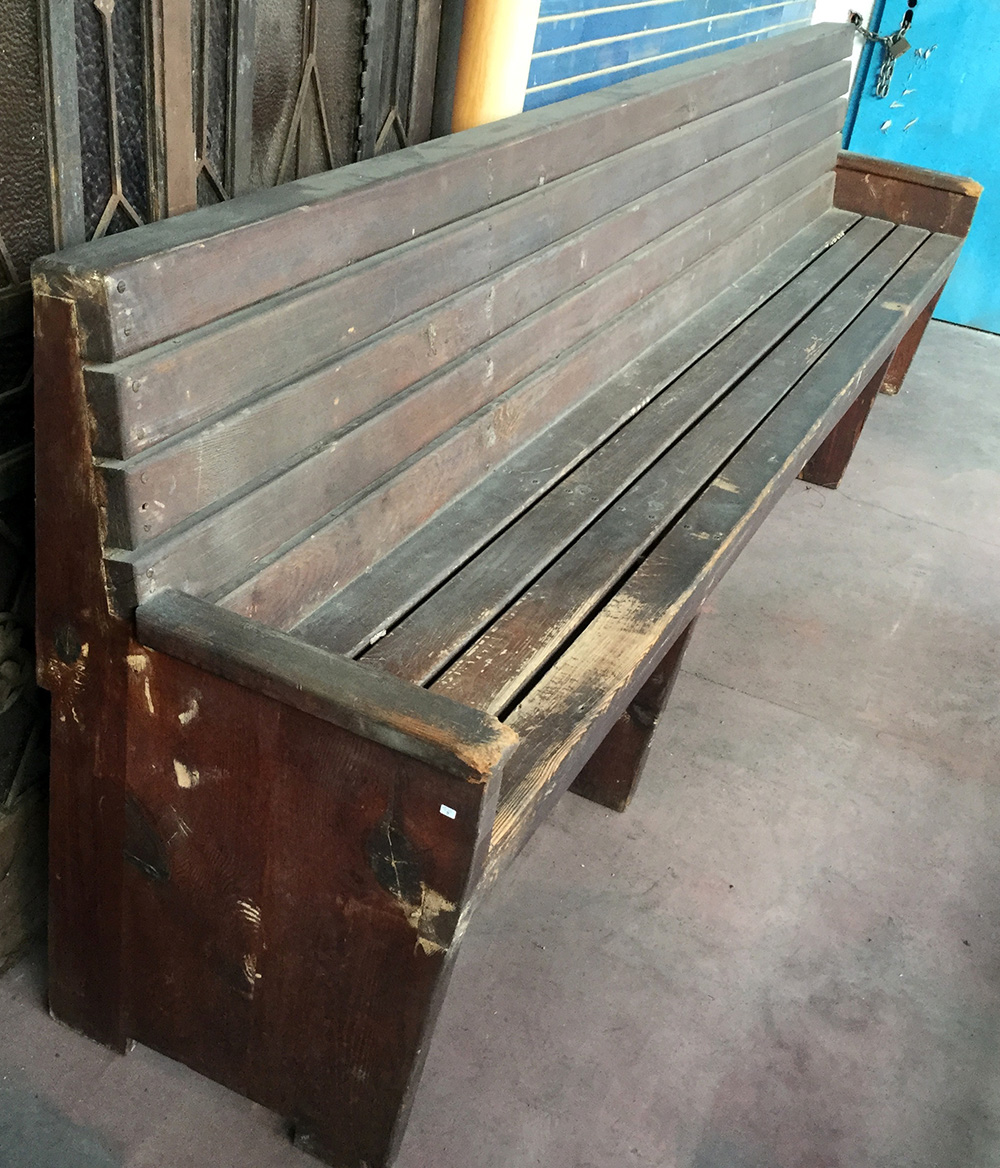 Panca da esterno in legno con seduta e spalliera a listelli (cm 345x100x56) (difetti e mancanze)