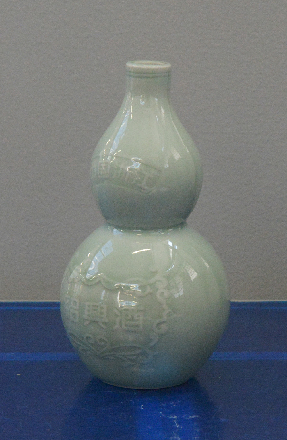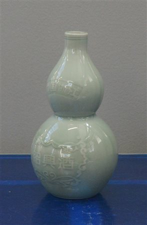 Vaso a guisa di doppia zucca a invetriatura color celadon con decoro in rilievo con iscrizione relativa alla città di Zhejiang e alla produzione di liquore (h. cm 22,5)