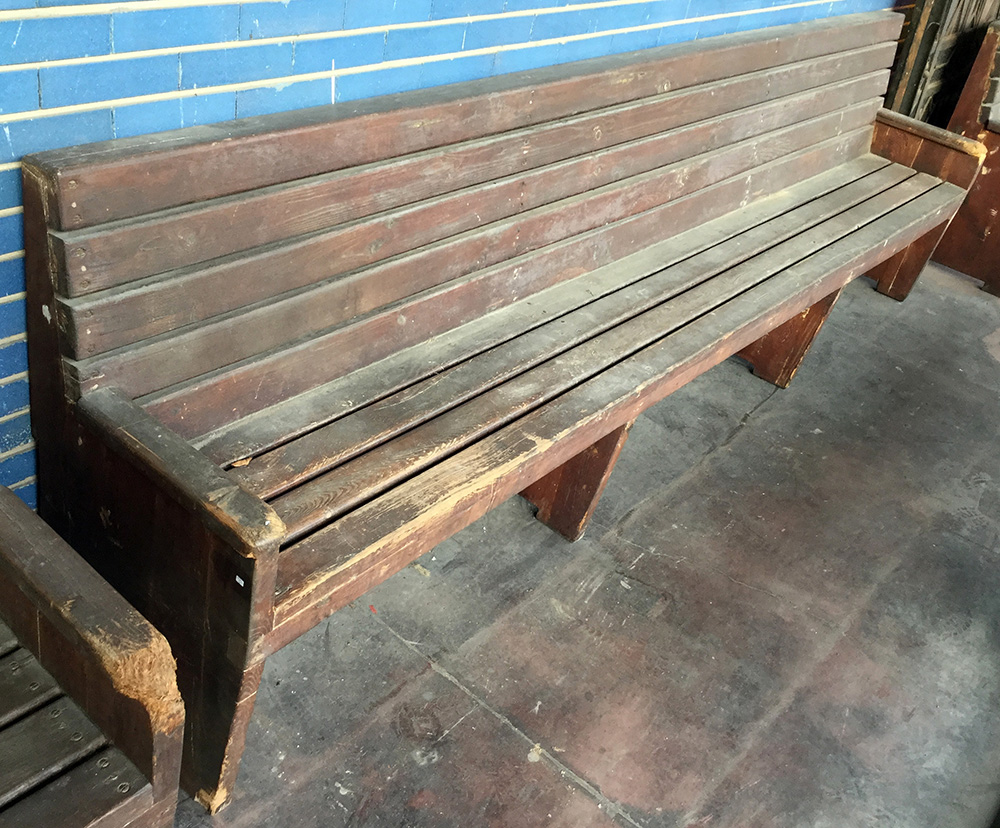 Panca da esterno in legno con seduta e spalliera a listelli (cm 345x100x56) (difetti e mancanze)
