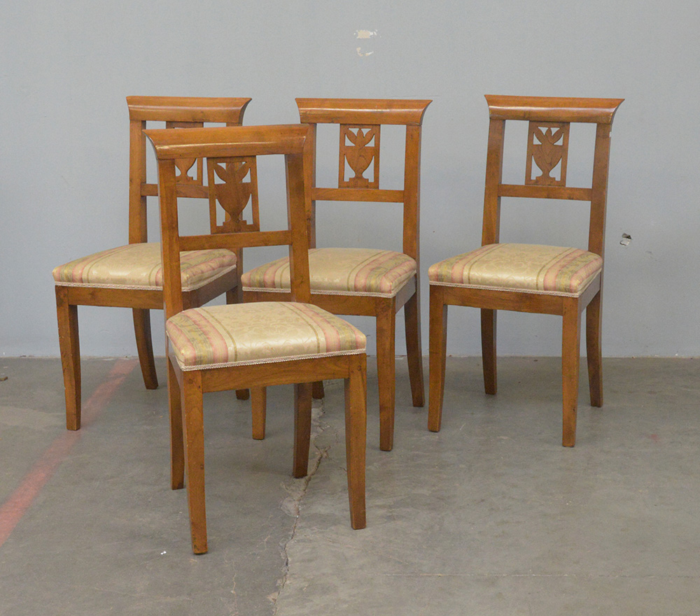 Gruppo di quattro sedie in noce con schienale a cartella traforata a motivo...