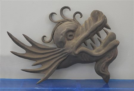 Manifattura del sud-est asiatico. Elemento decorativo in metallo a guisa di testa di drago (lungh. cm 50) (difetti)
