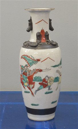 Vaso biansato in porcellana Famiglia Verde su fondo craquelè e bande decorative a imitazione del bronzo, marchio apocrifo Chenghua alla base