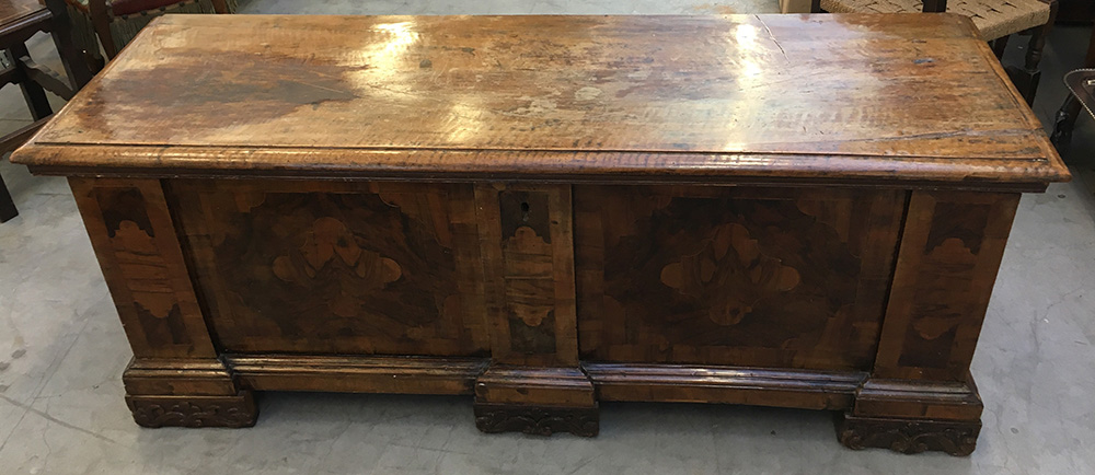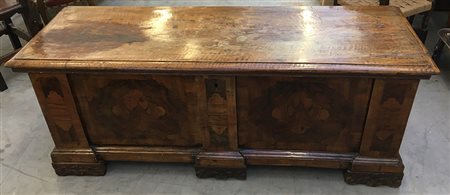 Cassapanca lastronata in noce con fronti e fianchi in radica e filettati....