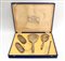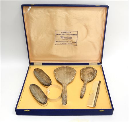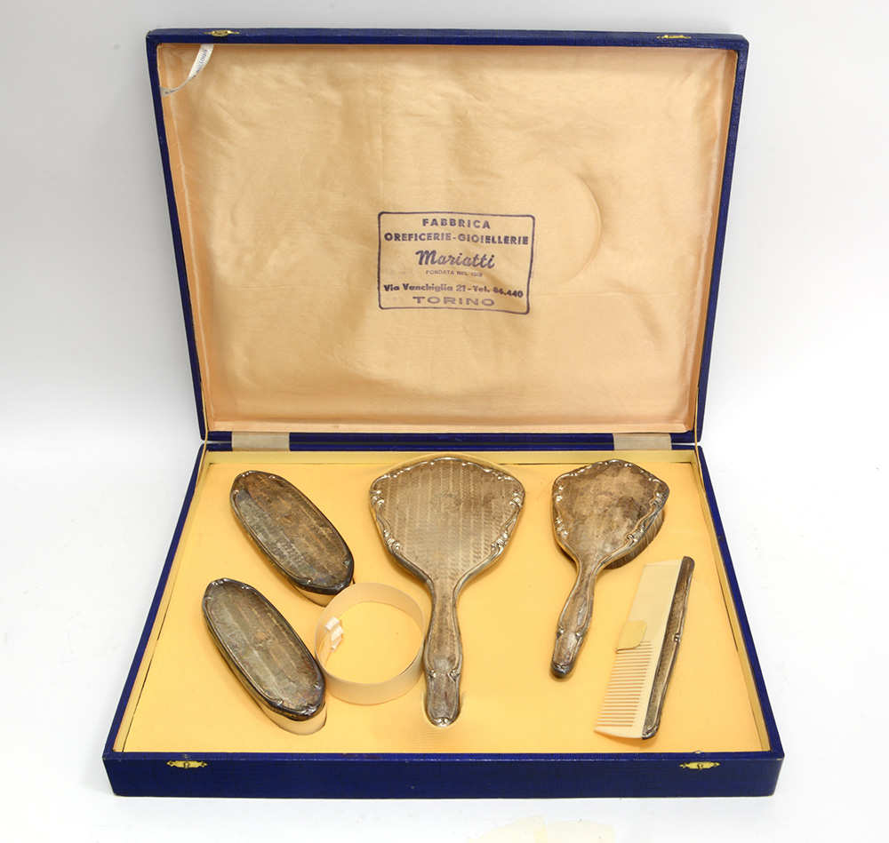 Servizio da toilette in lamina d'argento composto da tre spazzole, un pettine e uno specchio a mano, in custodia (lievi difetti)