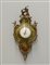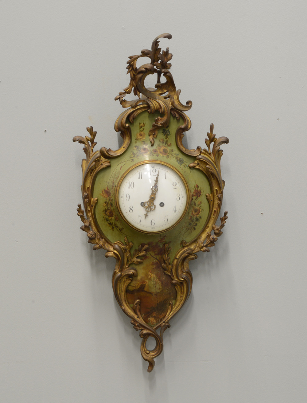 Orologio da muro con quadrante a numeri arabi in legno laccato decorato in policromia a fiori e figura femminile con fregi in metallo dorato. Sec. XX (difetti)