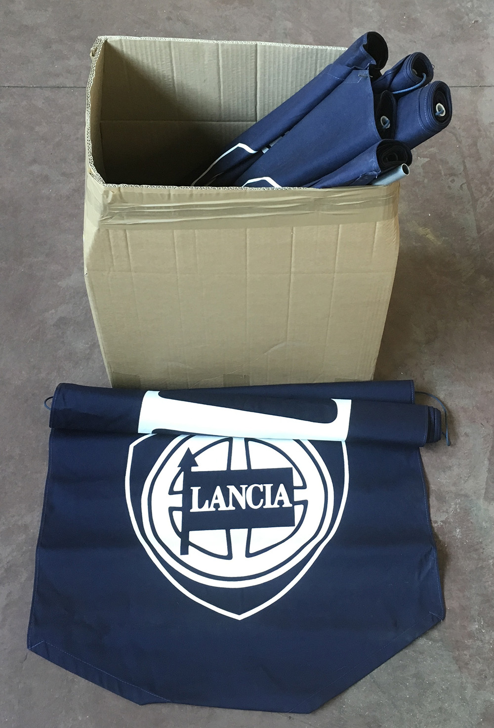Cartone contenente gonfaloni e bandiere della casa automobilistica Lancia (difetti)