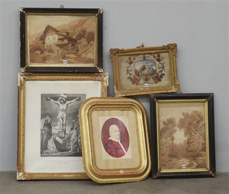 Lotto composto da cinque stampe e incisioni di diversa epoca, in cornici (difetti)