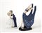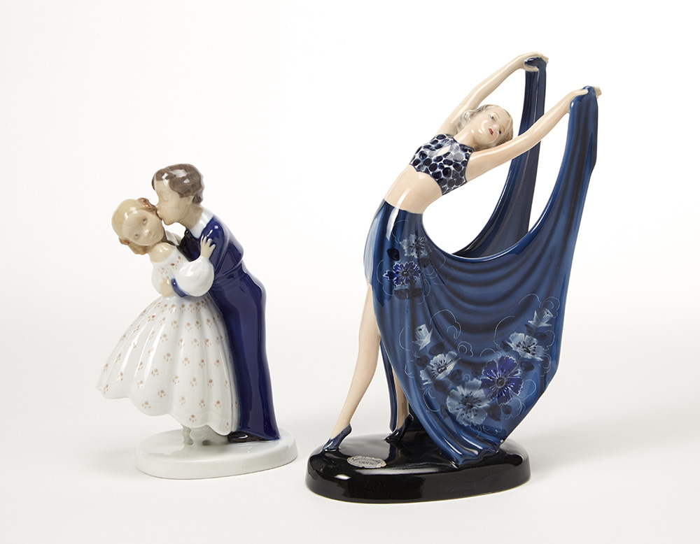 Lotto di due sculture in ceramica e porcellana raffiguranti una danzatrice e una coppia di fidanzati. Rispettivamente manifattura Goldscheider, Germania e manifattura B&G, Danimarca. Anni '20. Marcate sotto la base. (h max cm 24)