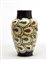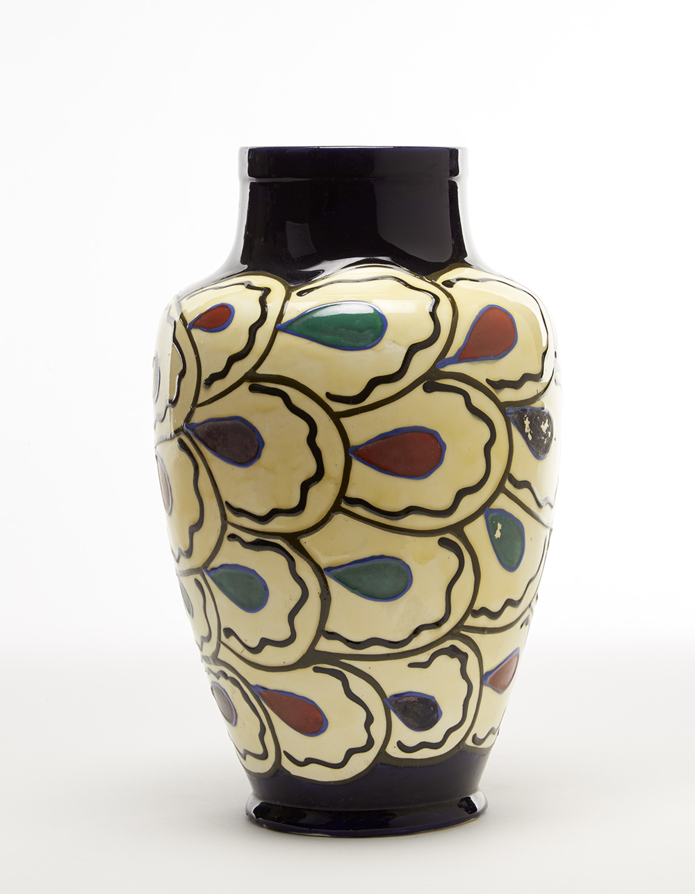 Vaso in ceramica decorata con figurazione a rilievo e smaltata in blu cobalto, beige, verde, rosso e bruno sotto vetrina. Italia, anni '20. Sotto la base sigla in nero non decifrata e "Z" incussa. (h cm 34,5) (difetti e restauri)
