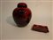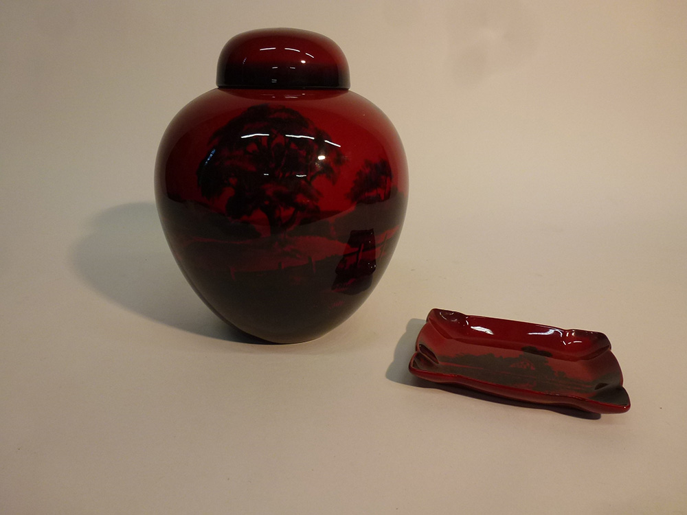 Lotto composto da una potiche con coperchio e un posacenere in porcellana rossa flambé decorata a paesaggi campestri. Inghilterra, prima metà secolo XX. (lievi difetti)