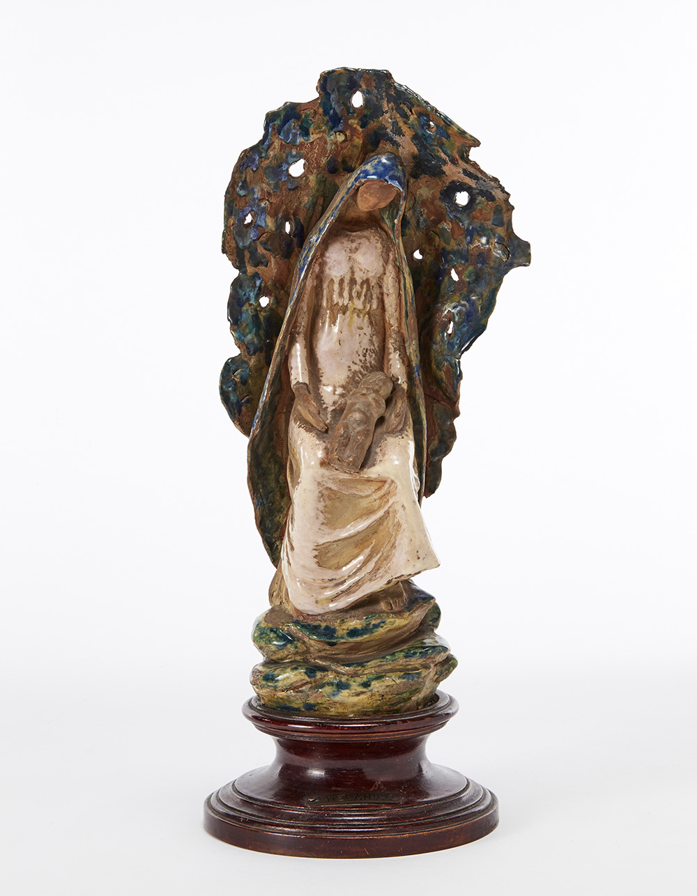 Scultura a tutto tondo in terracotta policroma a lustri metallici. Faenza, anni '40/'50. Montata su basamento in legno tornito. Firmata "MELANDRI" in basso a sinistra. (h cm 41) (difetti e restauri)