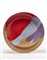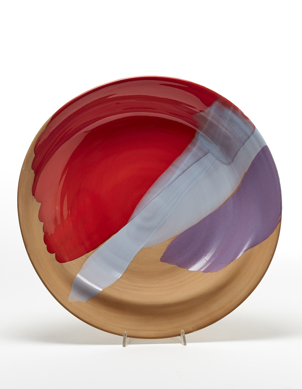 Grande piatto decorativo in terracotta lavorata al tornio e sagomata a mano, con colature di smalto nei colori rosso, grigio e lavanda. Italia, esecuzione recente. Firmato sul fianco. (d cm 47)