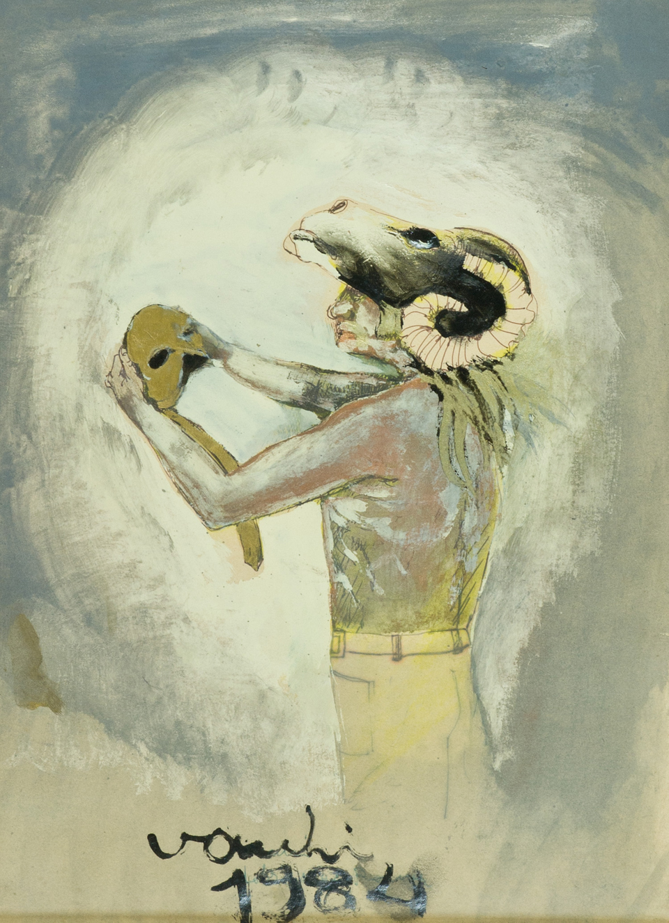 Sergio Vacchi Senza titolo, 1984 Tecnica mista su carta applicata su tavola, cm. 39x29 Firma e data in basso al centro.