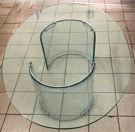 Tavolino da salotto in cristallo e tubolare metallico cromato. Italia, anni '70. (cm 120x37x81) (difetti)