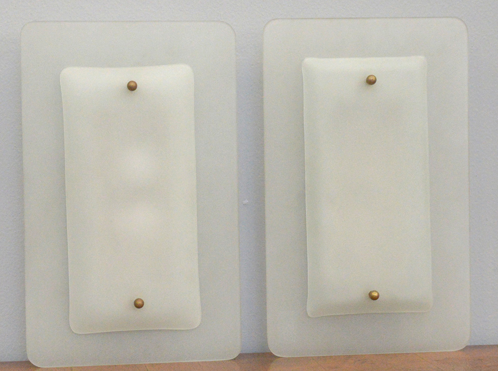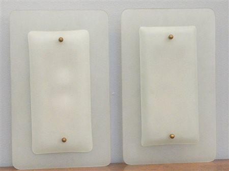 Coppia di appliques con struttura in metallo laccato bianco e vetri diffusori acidati e zigrinati sulla superficie esterna. Italia, epoca recente. (cm 25x40)
