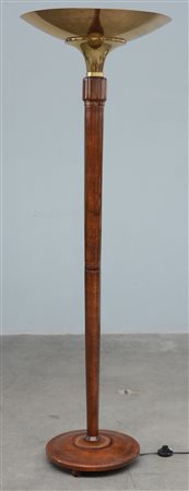 Lampada da terra tipo luminator con base e fusto in legno massello e diffusore a coppa in ottone lucidato. Italia, anni '90/2000. (h cm 170) (lievi difetti)