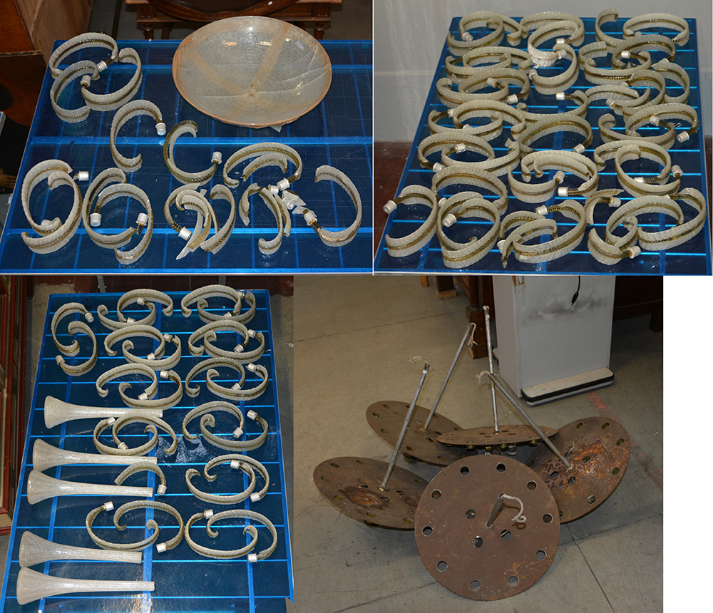 Parte di cinque lampade a sospensione con struttura in metallo, fusto e foglie in vetro pulegoso e pagliesco. Murano, anni '30. (gravi difetti e mancanze)