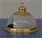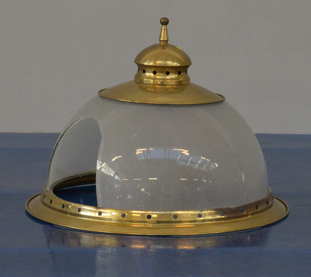 Plafoniera modello "Mezzo lampione". Produzione Azucena, Milano, anni '50. Ottone lucidato con paralume in vetro satinato sulla superficie interna. (d cm 36) (gravi difetti)