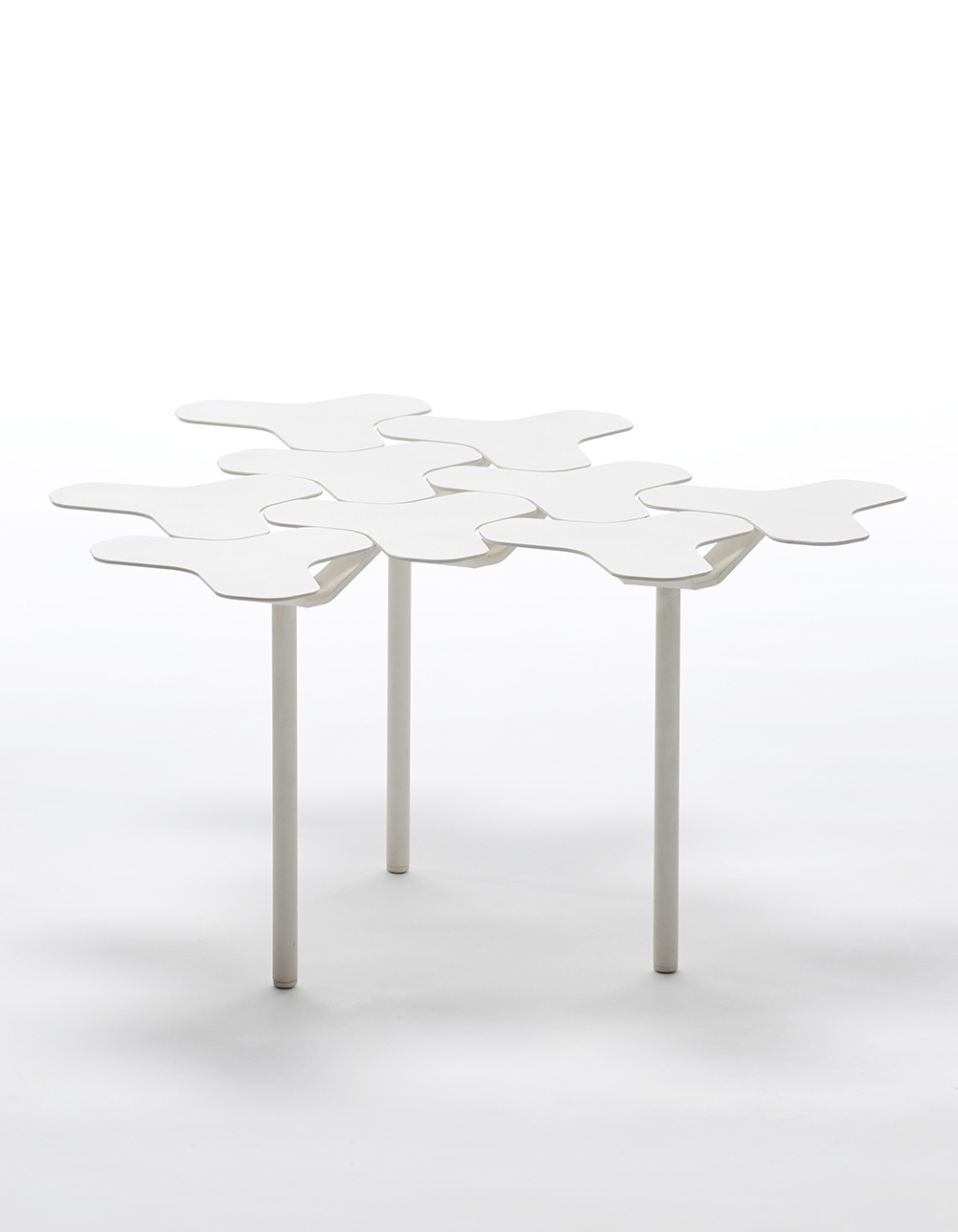 * Tavolino modello "Nanook T". Produzione Moroso, Milano, produzione recente. Struttura e piano in acciaio verniciato bianco. (cm 60x63x34)