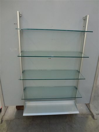 Libreria con ripiani in cristallo e alluminio anodizzato, montanti in alluminio anodizzato. ER, Italia.