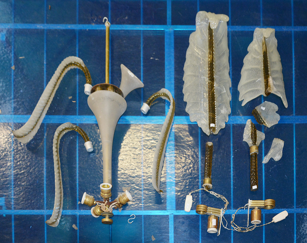 Coppia di appliques a forma di foglia in vetro pagliesco e pulegoso unito ad un lampadarietto a tre fiamme di uguale decoro. Anni '30. (gravi difetti e mancanze)